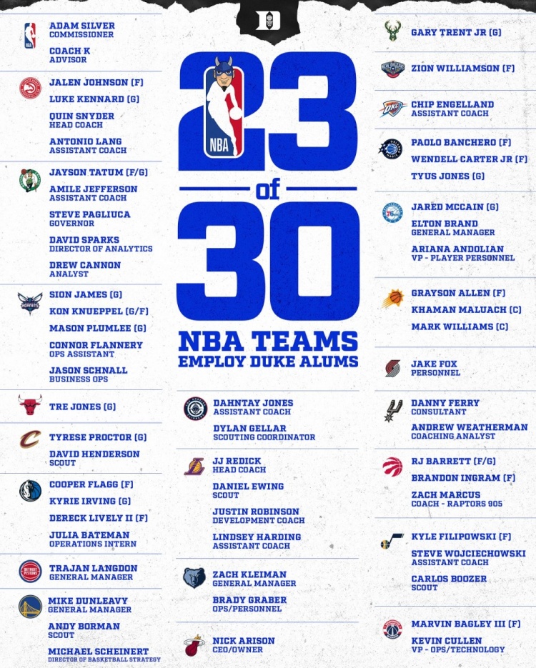 本赛季NBA30支球队里面有23支球队都有杜克系球员或球队雇员,甚至总裁萧华也是杜克毕业。历史上还有哪些知名NBA球星出自这里?今天老震来盘点一下。