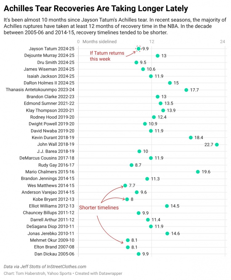 3月5日讯 雅虎体育记者Tom Haberstroh今日晒出一份球星跟腱撕裂(断裂)伤病的恢复数据。据统计,过去NBA球员跟腱撕裂后大约需要10个月就能复出。但在最近十年里,这个时间已经延长至约13个月。塔图姆目前已经休战将近10个月。本赛季至今,塔图姆因跟腱断裂伤势未能出战。但名记比尔·西蒙斯表示,塔图姆可能在周六打独行侠时复出。...